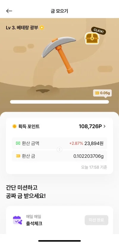 앱에는 금 팔기, AI 견적 확인 등 여러 기능이 있지만 이 사용자는 금을 많이 보유하고 있지 않았기 때문에 ‘금 모으기(앱테크)’ 기능에 집중했다고 합니다.